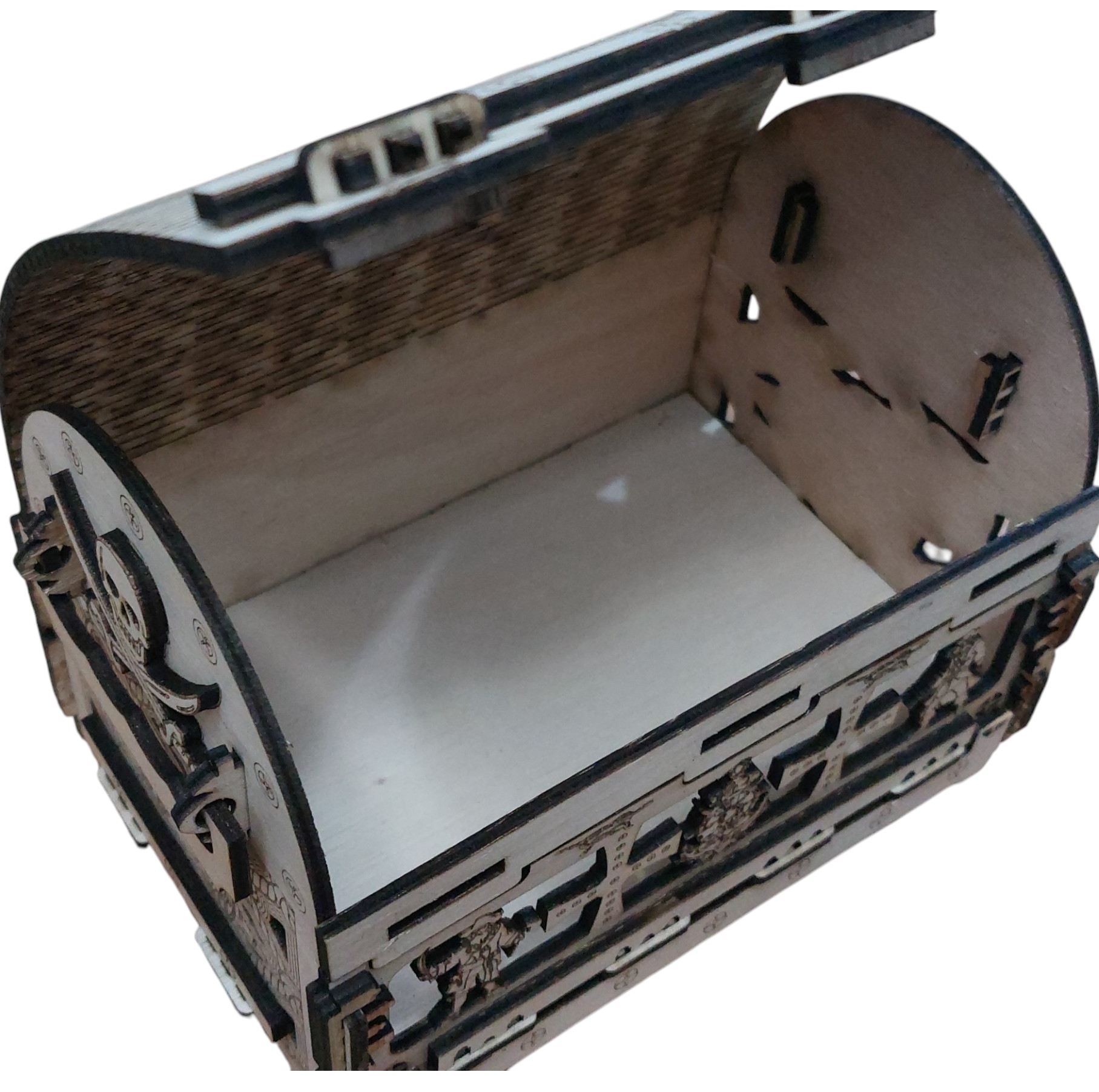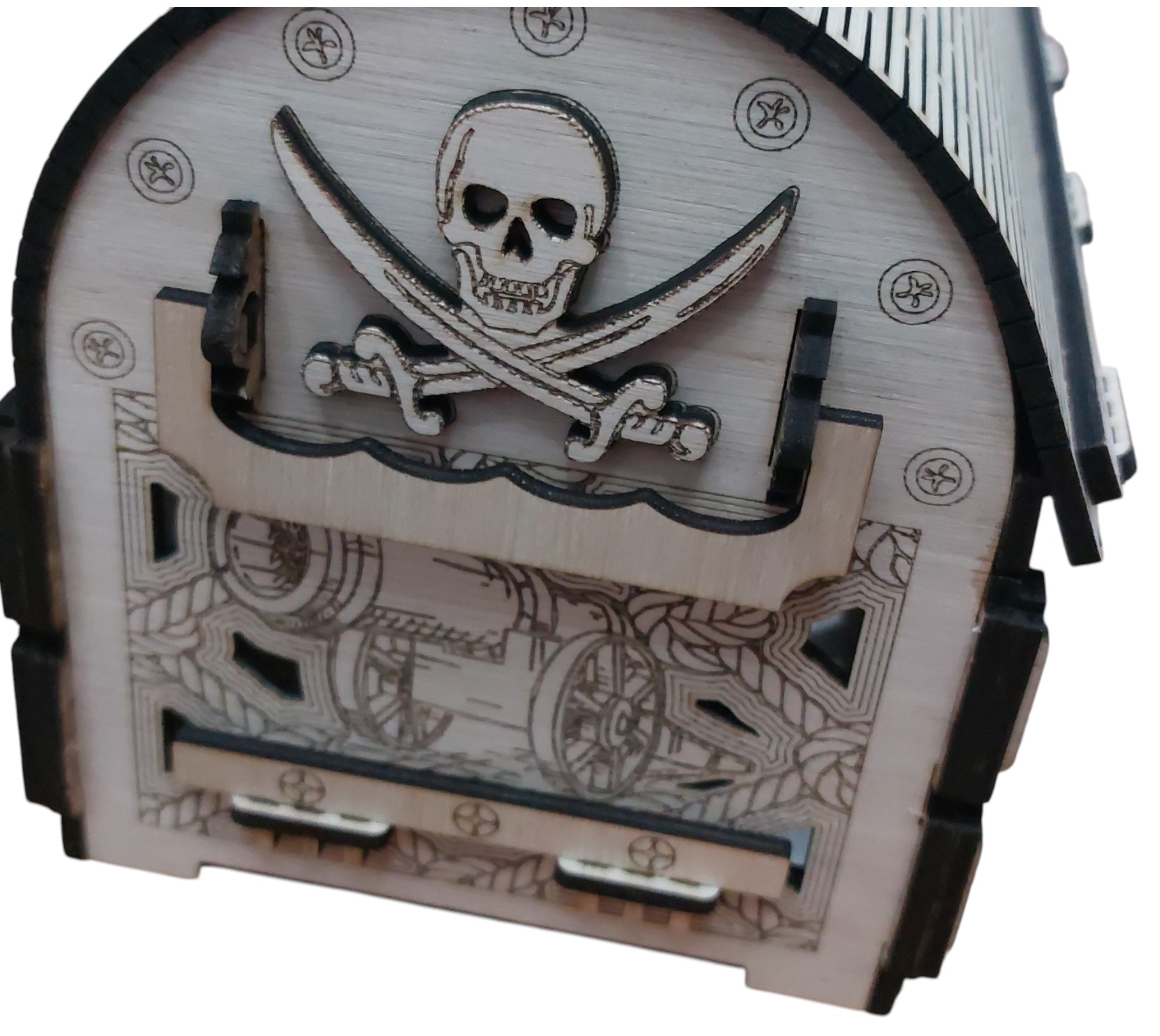 El cofre pirata es más que un simple objeto; es una pieza que evoca la historia, la aventura y el misterio del mar. Inspirado en los legendarios barcos piratas que surcaron las aguas durante siglos, este cofre se convierte en un elemento central que atrae la atención de todos quienes lo ven.