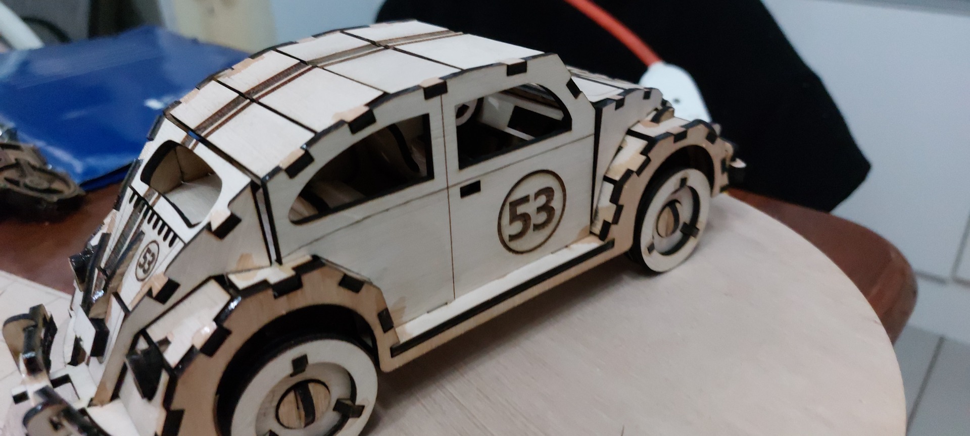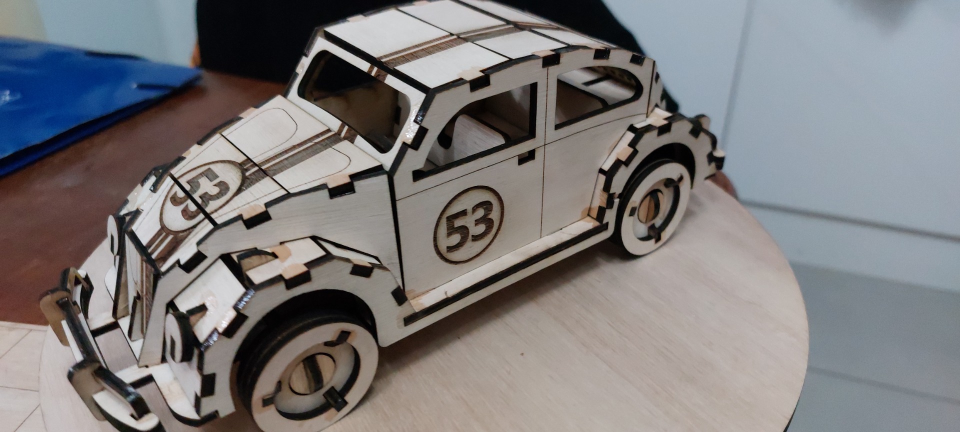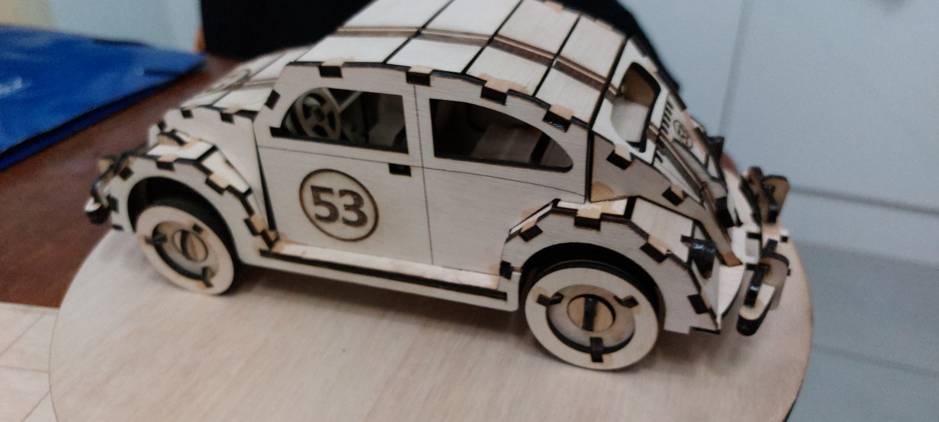 La elección de la madera contrachapada de eucalipto no es casual. Este material es conocido por su durabilidad y belleza natural, permitiendo resaltar las vetas y tonos cálidos que aportan carácter al modelo. La atención al detalle en la fabricación asegura que cada curva y línea del auto se reproduzca con fidelidad, creando una pieza que es tanto un homenaje a Herbie como una obra de arte en sí misma.